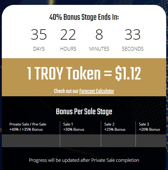 The Main Reasons To Invest In TROY Are To Make Money And Here’s How:1) TROY GOLD token offered with a bonus of 40%2) Burning Token 50% TROY will continue to increase the value of your remaining TROY GOLD tokens3) Estimated gold spot price increases when you exchange TROY, a gold token with a gold product4) You can recommend friends through our affiliate program and get Ethereum5) Free competition and Bounty campaign where you can complete simple tasks to get more tokens