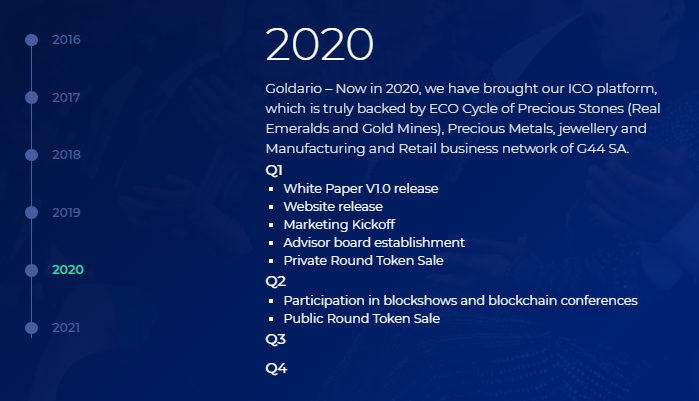 Goldario는 쥬얼리 기반 생태계를위한 플랫폼을 만들고 블록 체인에서 재무 모델을 사용했습니다. 이것은 기존 에메랄드 광산, 석재 절단 및 연마 공장, 보석 제조 공장 및 소매 상인 네트워크의 토큰입니다. 특히, 이런 방식으로 투자 최저 액이 낮은 사람과 순자산이 높거나 유사한 기관 투자가를 가진 개인을 허용합니다. 이를 통해 사람들은 기본 비즈니스에서 자신의 위치를 활용하고 수익성있는주기적인 혜택과 배당금을받을 수있는 생태계를 만듭니다.