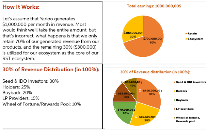 The Pay Sharing Token, or RST for short, is Yarloo’s reformist backbone, an important execution of its kind in what will someday look like the advancement of NFT and DeFi, RST is the means by which Yarloo can be armed as an adversary. underwrite the project, which can withstand any market valuation. How the capacity is is very basic, and can be reconfigured according to the tendencies of each association, but we will use Yarloo as a middle model of how RST will be used given that we are the main creator of this thought and its first integrator.