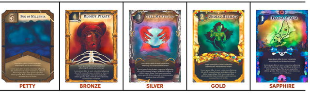 Card System Our card system is not too confusing. There will be 5 types of cards that are placed from the bottom up as follows: These 5 types of cards have very different limitations and characteristics. For example, the paltry cards only give 1 ticket for each card, given their low value, and the Bronze card gives 2 tickets for each card, besides that both have unusual characteristics and cannot be combined with other cards.